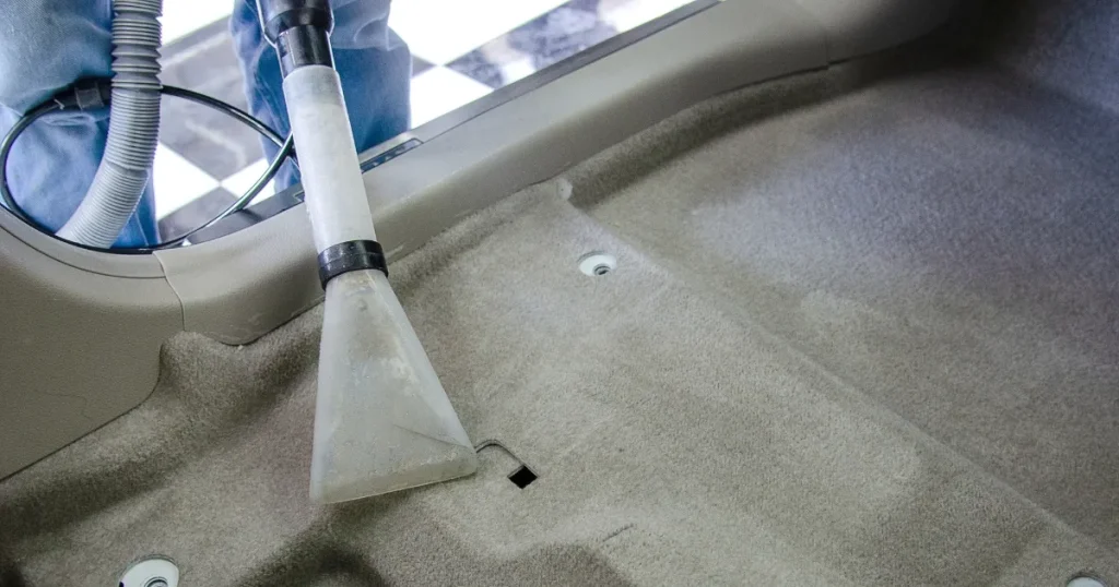 白い車のエンジンルームを整備中の整備士。コンプレッサーとクロスを使ってヘッドライト周辺を清掃している様子。
